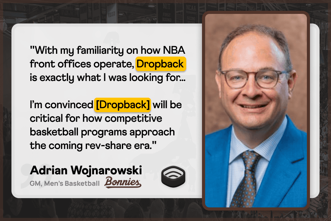 "With my familiarity on how NBA front offices operate, Dropback is exactly what I was looking for—tech to identify and build out efficient and impactful rosters with our budget. I’m convinced Dropback will be critical for how competitive basketball programs approach the coming rev-share era,” said Woj.
